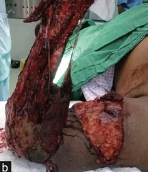 Avulsion amputation of left forearm with circumferential degloving of the skin through the upper arm...